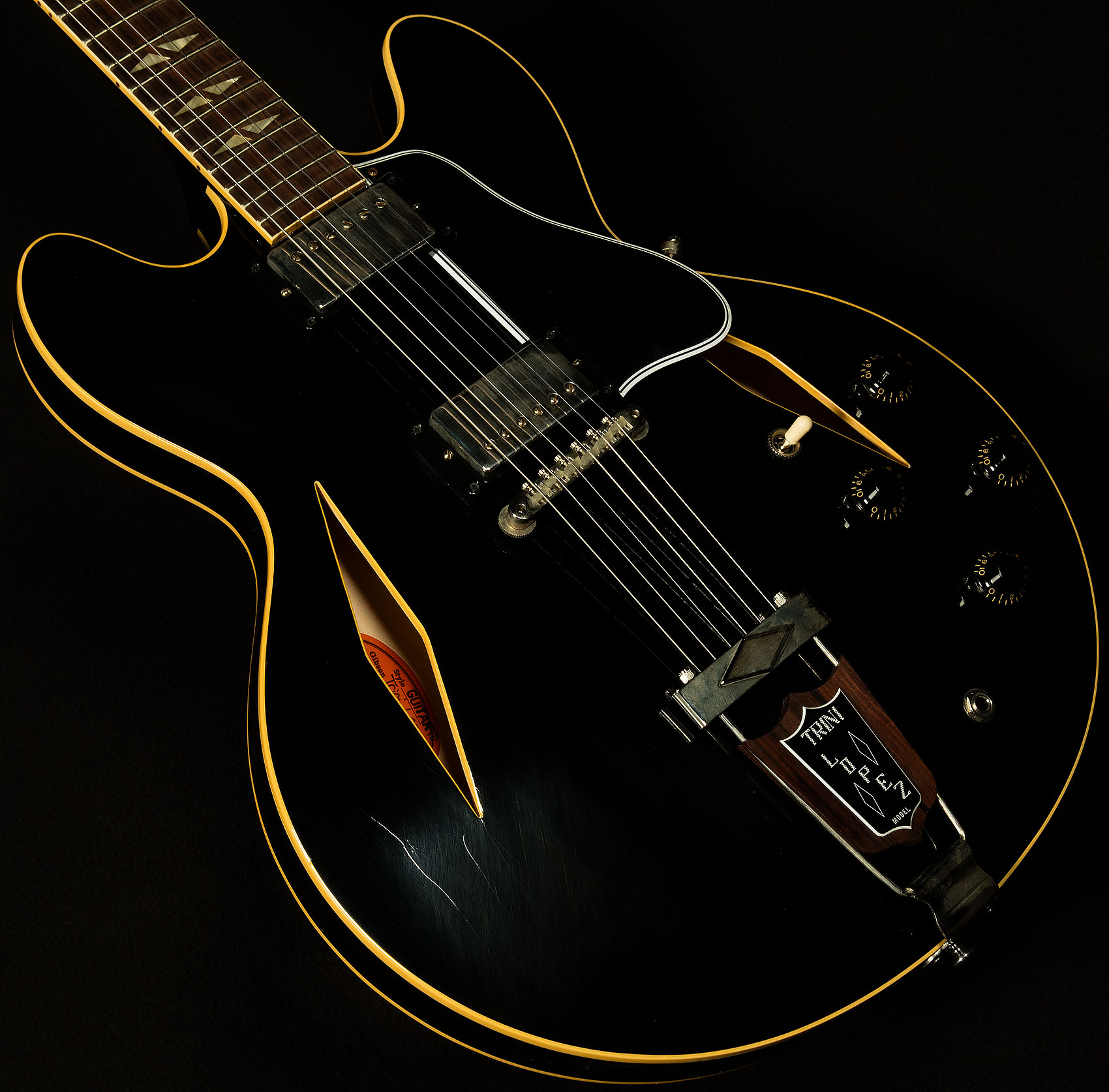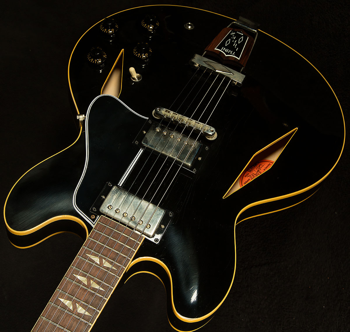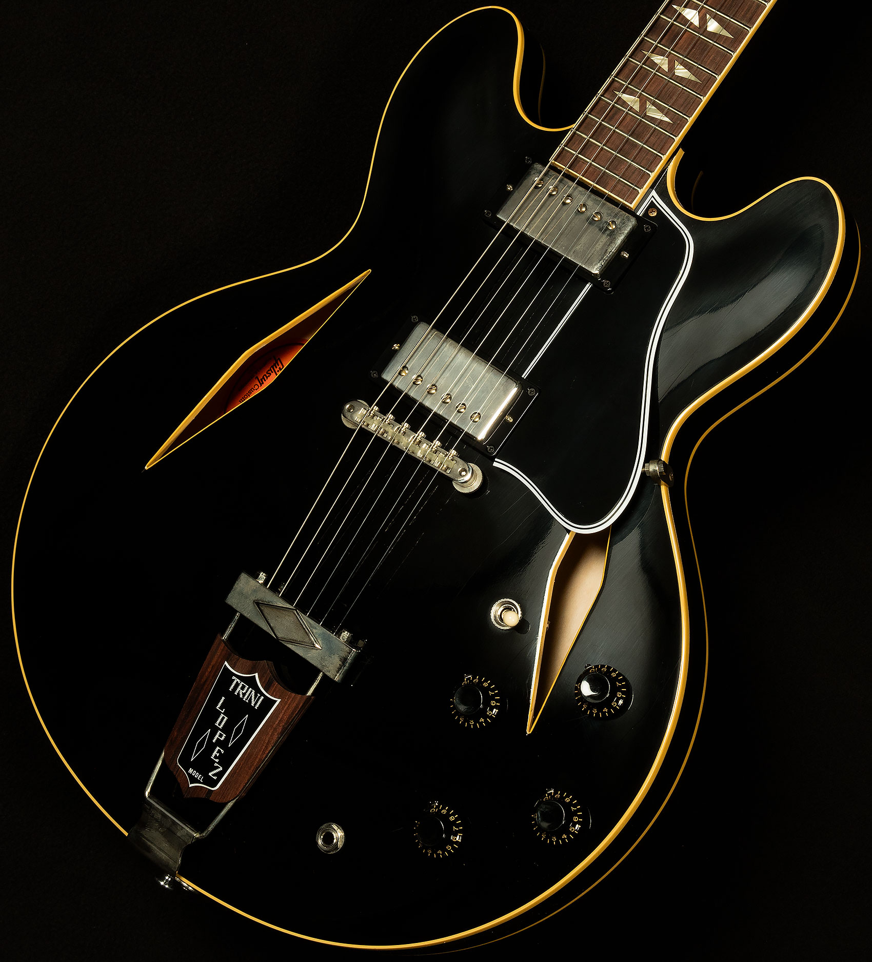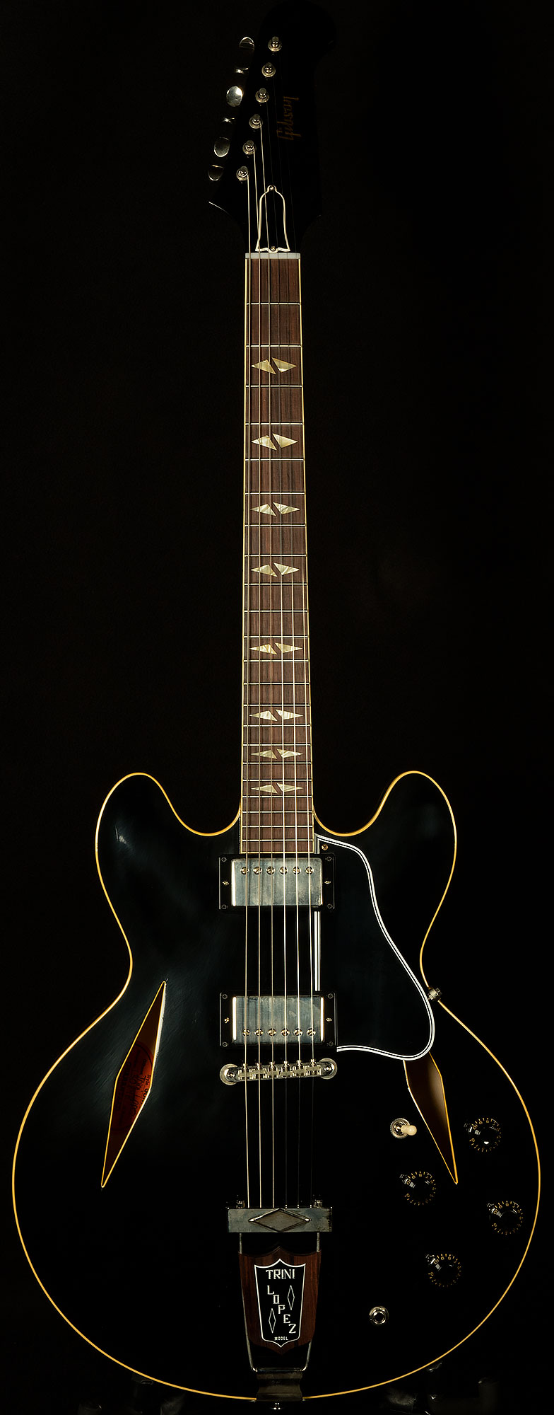 The 1964 Trini Lopez Standard Ultra Light Aged features an ES-style three-ply maple/poplar/maple semi-hollow thinline body with a solid maple centerblock for feedback resistance and enhanced sustain. The solid mahogany neck has a comfortable Medium C profile. It is equipped with a rosewood fretboard with 22 authentic medium jumbo frets and split diamond cellulose nitrate inlays that are one of the visual hallmarks of the Trini Lopez Standard. The diamond theme continues with the f-holes on the body, which are also diamond-shaped, as well as the single diamond trapeze tailpiece with Trini Lopez insert. The six-on-a-side headstock is often referred to as a Non-Reverse Firebird headstock. However, the design actually originated with the Trini Lopez Standard and predates the Non-Reverse Firebird, which wasn’t introduced until 1965.