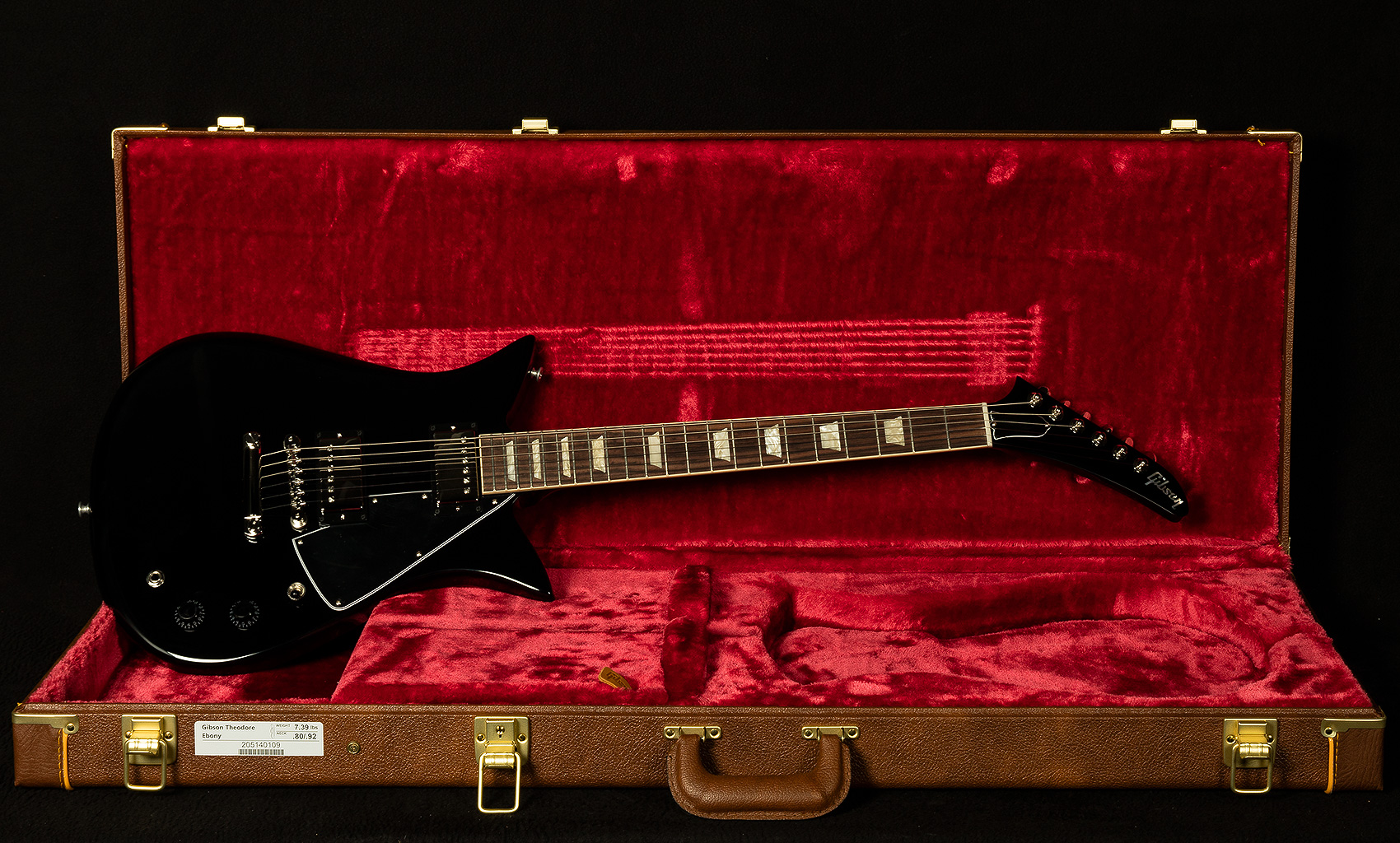 Developed from original drawings discovered in the Gibson Archives, the Gibson Theodore Standard is based on a design from 1957 that was only previously available as a limited edition 2022 Gibson Custom model. Its features include a mahogany body, scimitar headstock with Grover Mini Rotomatic tuners, and double Florentine cutaways that provide unimpeded access to all 22 frets on the rosewood-capped, SlimTaper mahogany neck. The balanced construction is exceptionally comfortable, and the powerful ’57 Classic and ’57 Classic Plus humbucker pickups produce effortless sustain and a rich diversity of tones. It is available in Antique Natural, Vintage Cherry, and Ebony. A hardshell case is also included.