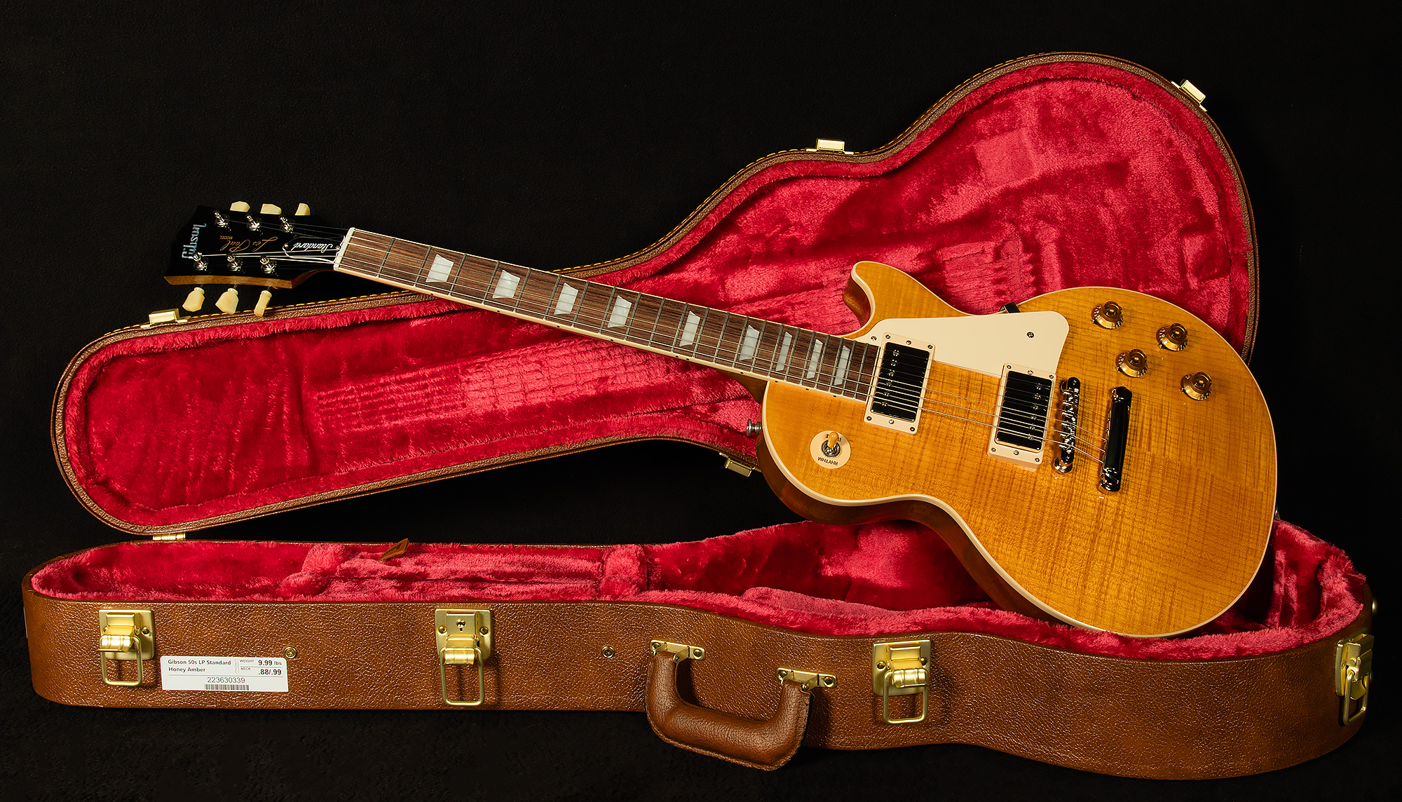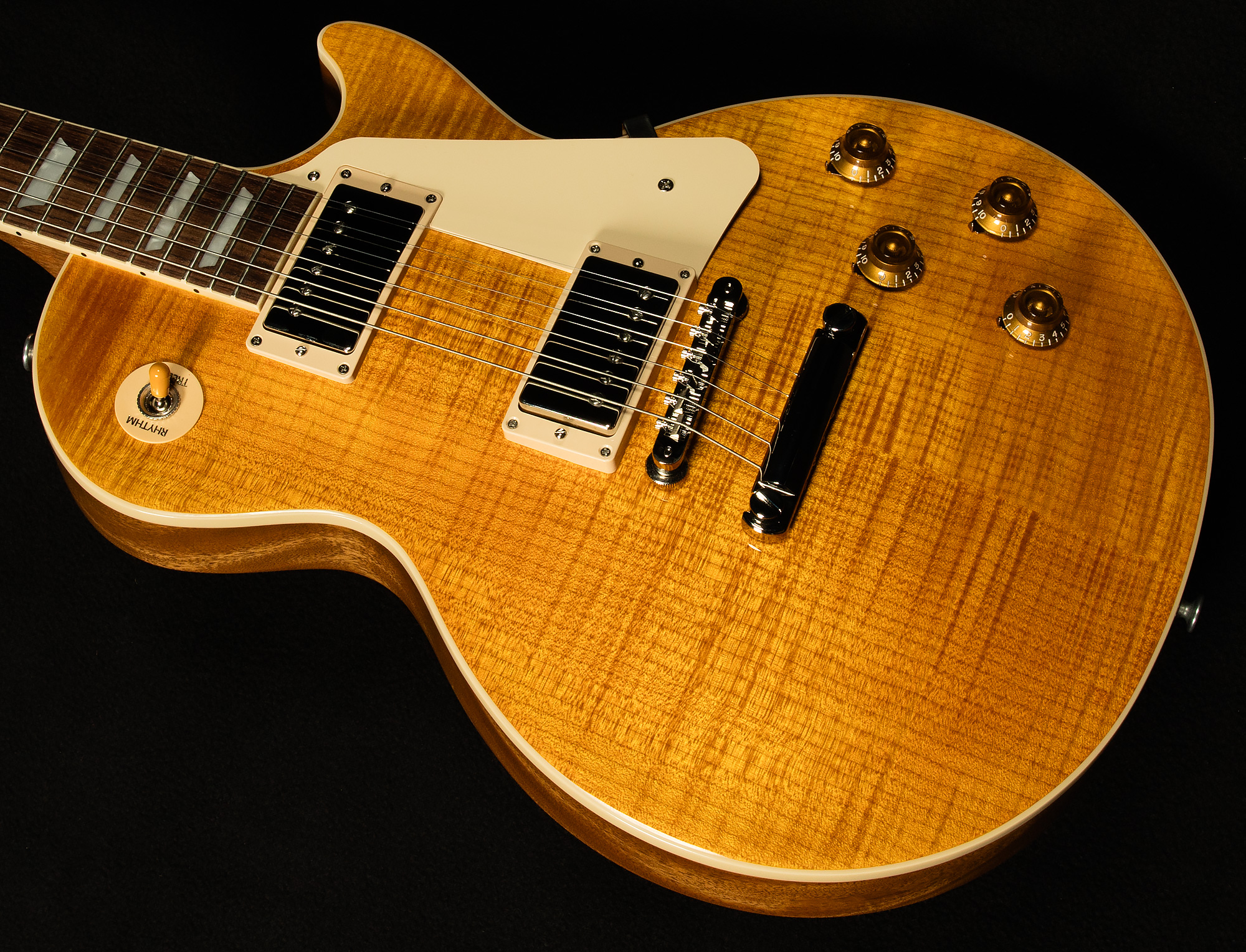 The Les Paul Standard 50s Figured Top returns to the classic design that made it relevant, played, and loved – shaping sound across generations and genres of music. It pays tribute to Gibson's Golden Era of Innovation and brings authenticity back to life. It boasts a solid mahogany body, an AA figured maple top, and a distinctive translucent custom color nitrocellulose lacquer finish that showcases the figured maple top. The mahogany neck has a rounded '50s Vintage profile and a rosewood fingerboard with trapezoid inlays. The Les Paul Standard '50s Figured Top is equipped with an ABR-1, the classic-style Tune-O-Matic bridge, an aluminum Stop Bar tailpiece, Vintage Deluxe tuners with Keystone buttons, and gold Top Hat knobs. The calibrated Burstbucker 1 (neck) and Burstbucker 2 (bridge) pickups are loaded with Alnico 2 magnets and wired to audio taper potentiometers and Orange Drop capacitors. A hardshell case is also included.