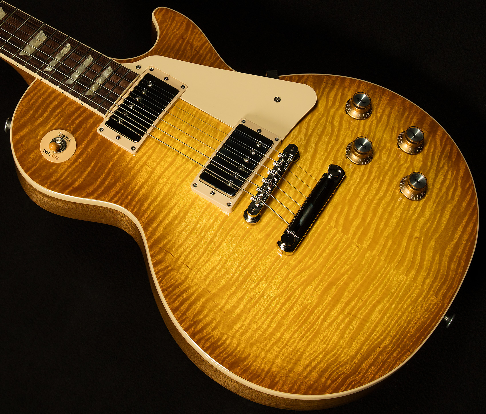 Wildwoodians, we are loath to contradict AC/DC, but it is NO LONGER a long way to the top if you wanna rock and roll, as long as the top you are seeking is made of exquisite maple. That's right–our friends at Gibson are building souped-up USA Les Pauls with jaw-dropping, outlandishly beautiful tops from the Custom Shop wood vault! If you let out a Ric Flair-esque "WOOOOOOOOO" upon learning that information, you're not alone, as there was much yelling, screaming, and open joyous weeping around the shop when we learned Gibson was building these bad boys. You see, a Custom Shop top on a USA instrument is simply unprecedented, and we love firsts here at Wildwood.