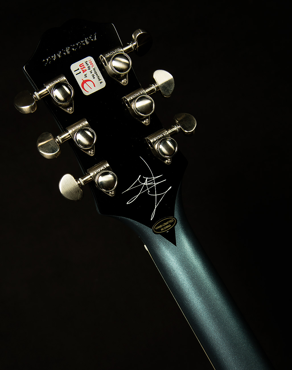 The Jared James Nichols “Blues Power” Les Paul Custom is the latest signature model from the Gibson Brand Ambassador and blues-rock powerhouse that hails from Les Paul’s hometown. The Jared James Nichols “Blues Power” Les Paul Custom features classic Les Paul Custom styling and cosmetic appointments and a stunning Aged Pelham Blue finish. It pairs that with brushed nickel hardware, including Grover Locking Rotomatic tuners and a wraparound Lightning Bar bridge for rock-solid tuning stability. A single Seymour Duncan Silencer JJN P90B in the bridge position ensures righteous tone and hum-free performance, and the included EpiLite case helps keep your investment safe and secure.