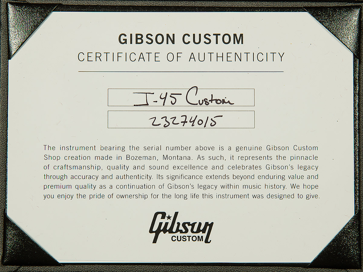 The J-45 is the most popular Gibson acoustic model of all time. Its distinctive tone has made it the choice of musical legends across genres for decades. Now, the Gibson Custom Shop is proud to introduce the new J-45 Custom. The classic J-45 features that players demand are all here, including a Sitka spruce top, mahogany back and sides, and a mahogany SlimTaper neck with a 24.75” scale length. The J-45 Custom takes things to the next level with Les Paul Custom-inspired cosmetics, including an Ebony nitrocellulose lacquer finish, multi-ply binding on the top and back, a bound Les Paul-style peghead with a Custom split diamond inlay in mother of pearl, a bound ebony fretboard with mother of pearl Custom Block inlays, and gold Grover Rotomatic tuners. It comes equipped with L.R. Baggs Session VTC electronics and a hardshell case.