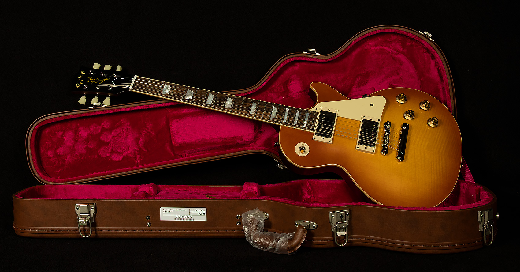 Made in collaboration with the Gibson Custom Shop, the Epiphone 1959 Les Paul Standard is Epiphone’s incredible recreation of the rare vintage classic, updated to be more authentic and true to the originals than ever. It features a mahogany body with a maple top with a AAA flamed maple veneer, a one-piece mahogany neck with a comfortable ’59 rounded, medium C profile, long neck tenon, and Gibson-style “open book” R9 headstock shape, VOS (Vintage Original Sheen) finish, Gibson Custombucker humbucking pickups, Switchcraft selector-switch and 1/4” output jack, CTS pots, '50s era wiring, Mallory capacitors, non-beveled pickguard, Epiphone Deluxe vintage tuners with Keystone buttons, and a vintage-style brown and pink hardshell case. Play one today, and prepare to be amazed!