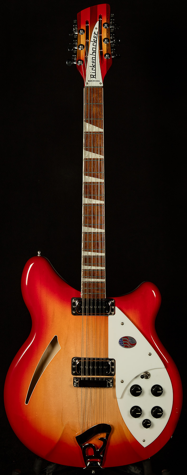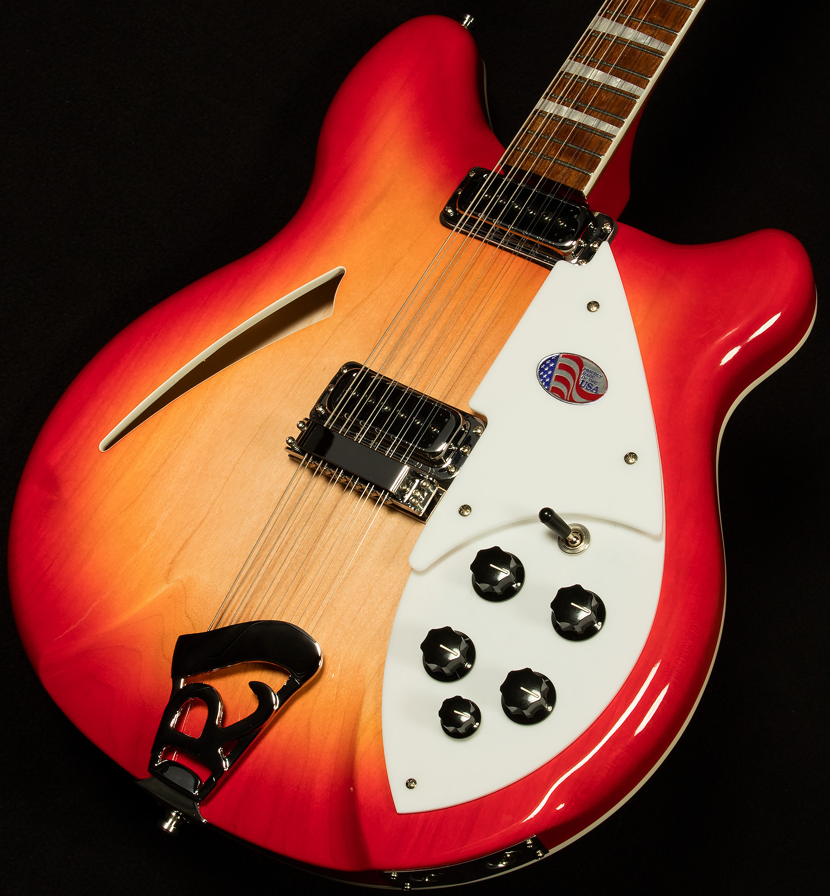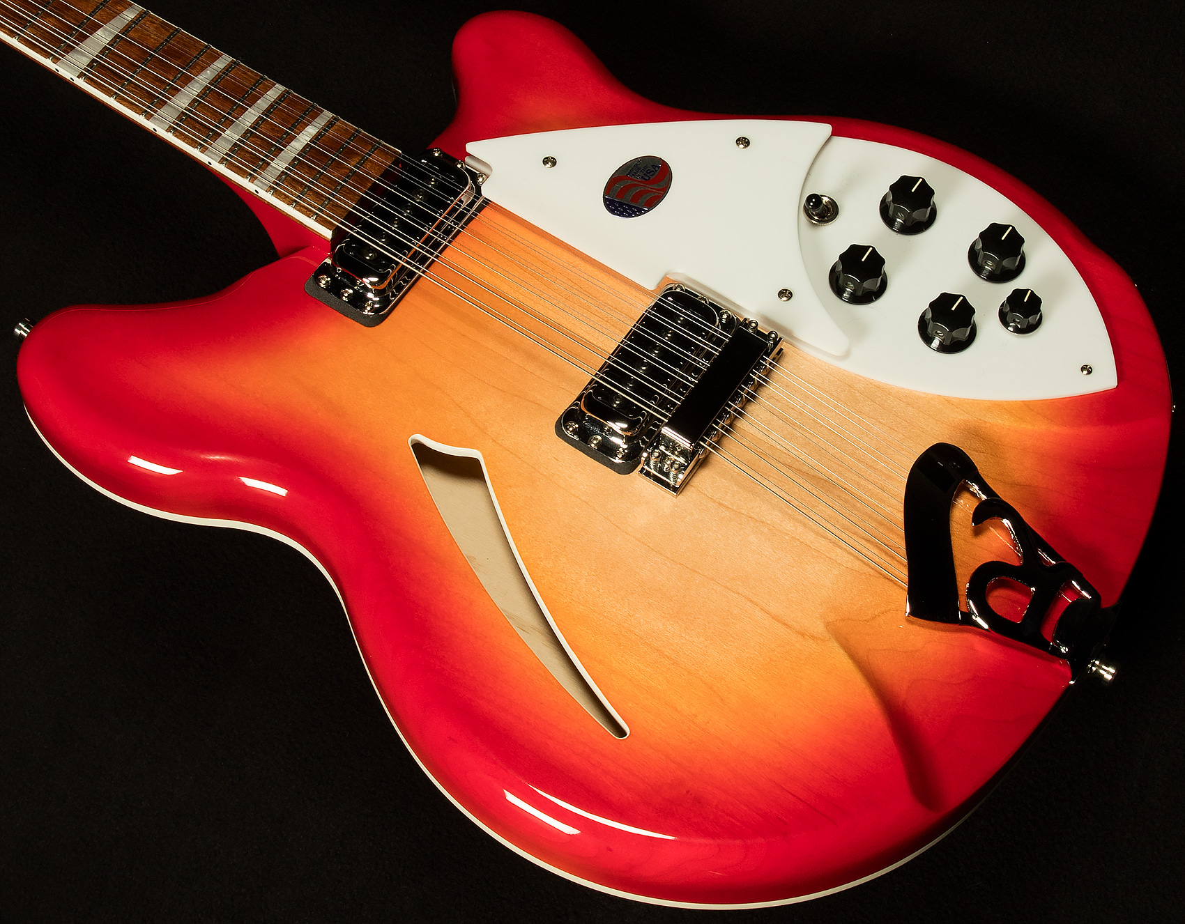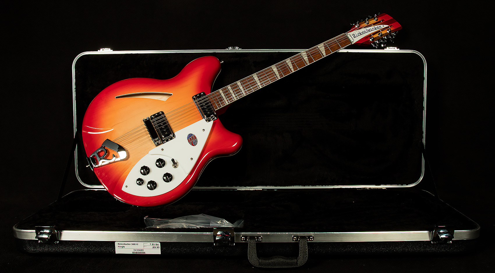 The modern Rickenbacker 360/12 features many of the classic appointments we remember from old videos of the Beatles: triangle inlays, a glossy fretboard, gorgeous "glo" finishes, the iconic "R" tailpiece, and a set neck for extra sustain and resonance. However, they've updated their classic sound with modern Rickenbacker "Hi-gain" pickups, which have the same sort of frequency response as vintage Rickenbacker pickups but with higher output.