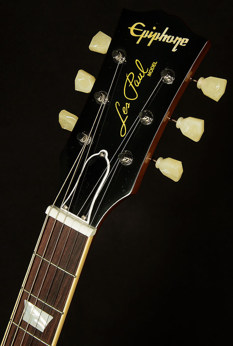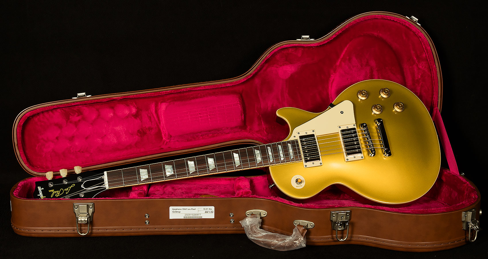 1957 was the year that the Les Paul, as most players think of it today, truly came into its own. It was the first full year that it had Patent Applied For humbucker pickups installed. The humbuckers, along with the ABR-1 Tune-O-Matic bridge and Stop Bar tailpiece that first appeared on a Les Paul with the introduction of the Les Paul Custom in late 1953 and on the Goldtop in late 1955, were defining features that many players still prefer over the earlier models that had a wraparound bridge/tailpiece and P-90 pickups and made the Les Paul into a true fire-breathing rock icon. Now, Epiphone, in collaboration with Gibson Custom, is very proud to introduce the 1957 Les Paul Goldtop Reissue, a stunningly authentic Inspired by Gibson Custom reissue of those early humbucker-equipped Les Paul Goldtops that delivers vintage Les Paul looks and performance at an accessible price. It has a genuine mahogany body with a carved, plain maple cap. It is finished in a new Vintage Gloss version of the classic Gold color that gives it a vintage appearance without looking overly aged. The one-piece genuine mahogany neck has a 50s Rounded Medium C profile and a long neck tenon for excellent stability and sustain. The bound rosewood fretboard is adorned with mother-of-pearl trapezoid inlays and equipped with 22 medium jumbo frets, just like the original models from 1957. It has an aged mother-of-pearl Epiphone logo and the words “Les Paul Model” silkscreened in gold on the Gibson-style “open book” headstock. Even the side dot position markers are the same size as on vintage 1957 Les Paul Standard models and are placed in historically accurate locations. The hardware is nickel-plated, including the ABR-1 Tune-O-Matic bridge, historical aluminum Stop Bar Tailpiece, and the Epiphone Deluxe “Single Ring” Keystone button tuners. The electronics are also first-class, with two USA Gibson Custombucker humbucking pickups with Alnico 3 magnets that are hand-wired to CTS potentiometers, Bumblebee paper-in-oil capacitors, and a Switchcraft pickup selector toggle switch and 1/4” output jack. A historic-inspired hardshell case with a Brown exterior and pink plush interior and Inspired by Gibson Custom Graphics is also included. The 1957 Les Paul Goldtop Reissue isn’t just a guitar; it’s a bridge to a symphony of possibilities, willing and ready to help you make your own mark on music history.