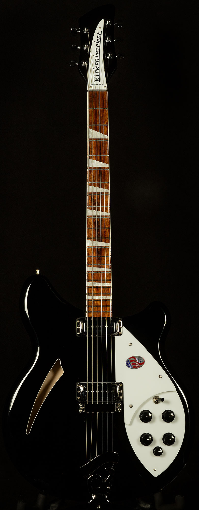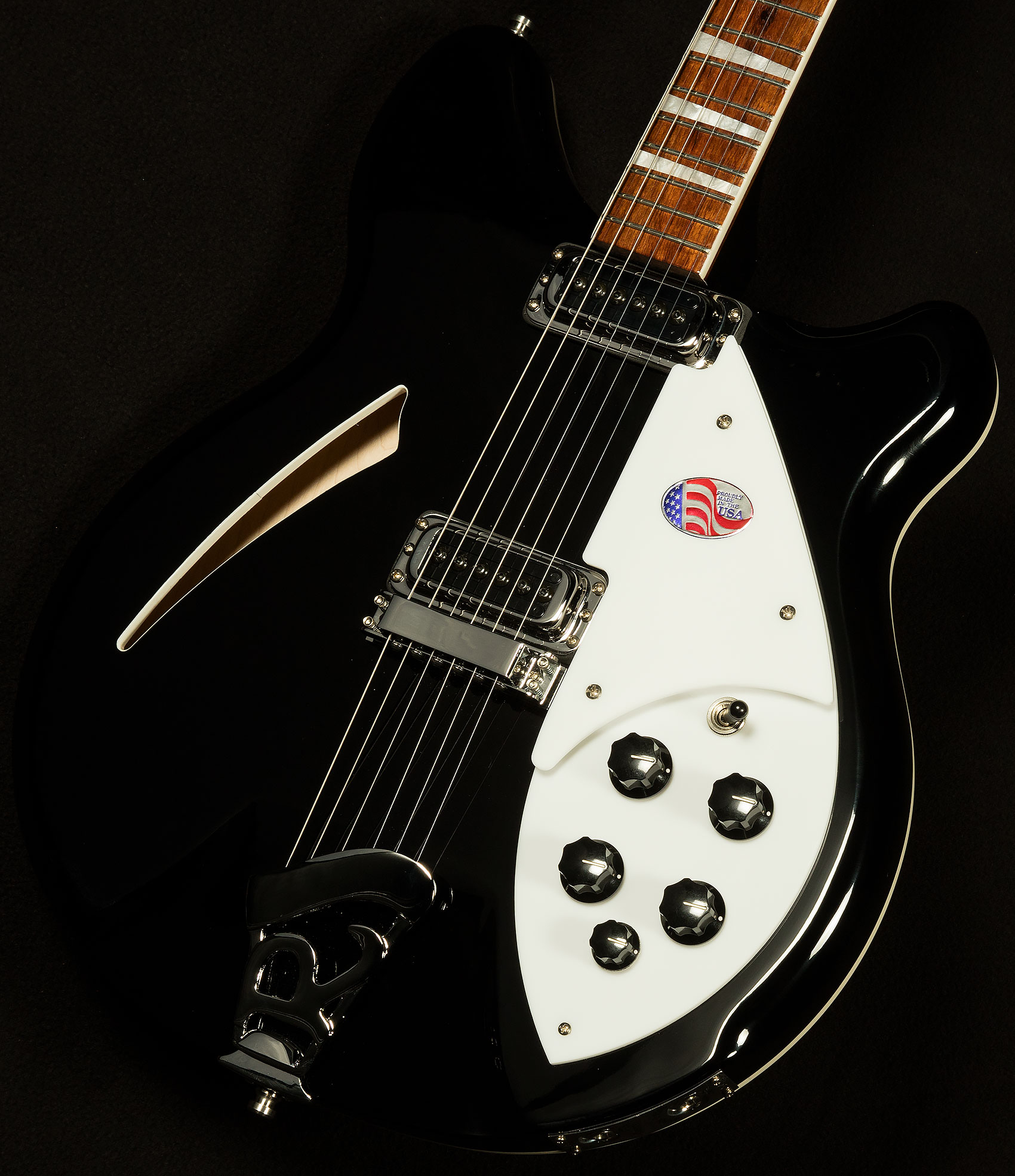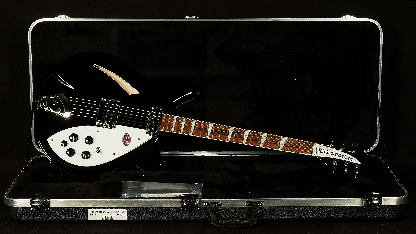 The modern Rickenbacker 360 features many of the classic appointments we remember from old videos of the Beatles: triangle inlays, a glossy fretboard, gorgeous "glo" finishes, the iconic "R" tailpiece, and a set neck for extra sustain and resonance. However, they've updated their classic sound with modern Rickenbacker "Hi-gain" pickups, which have the same sort of frequency response as vintage Rickenbacker pickups but with higher output.
