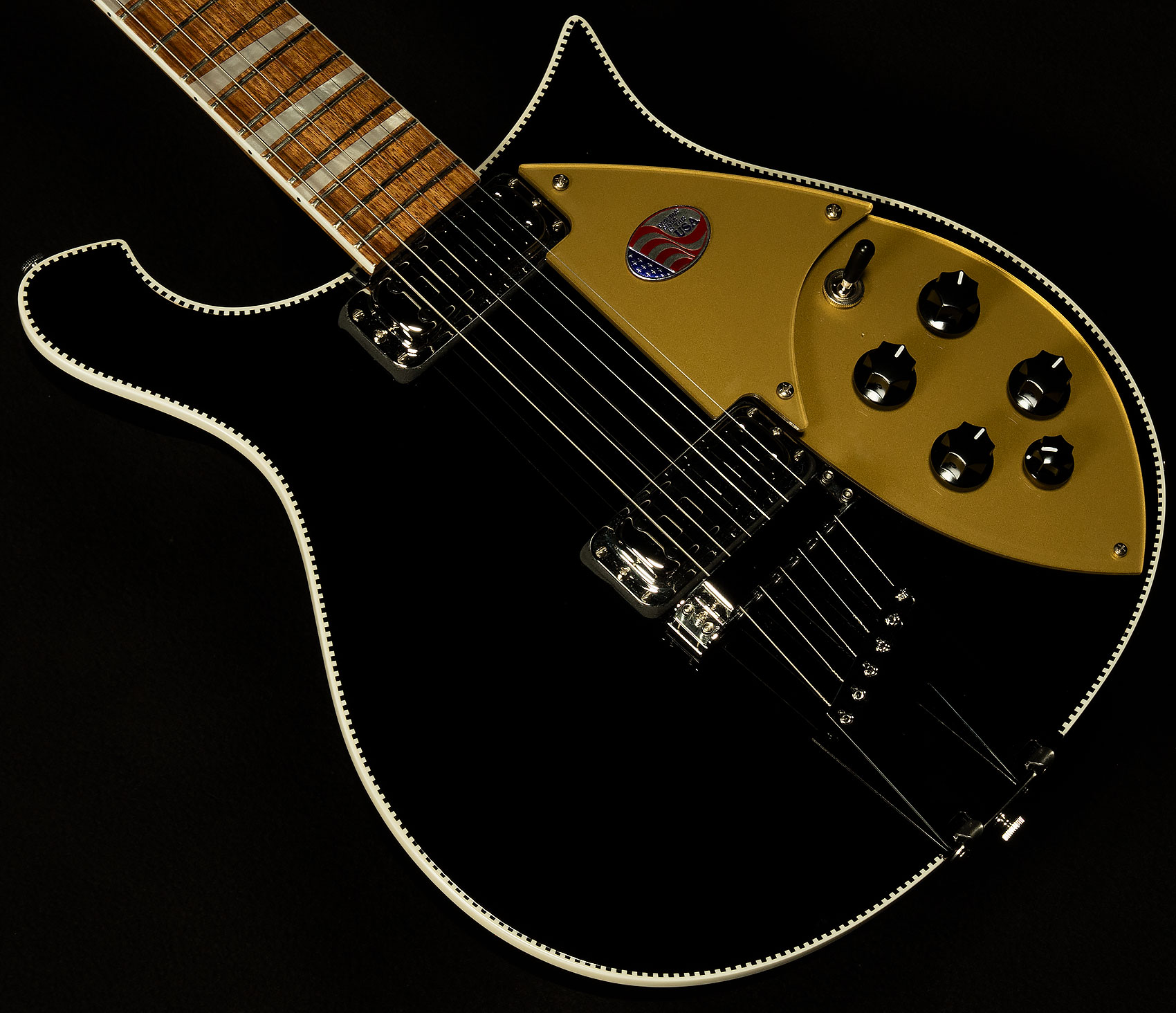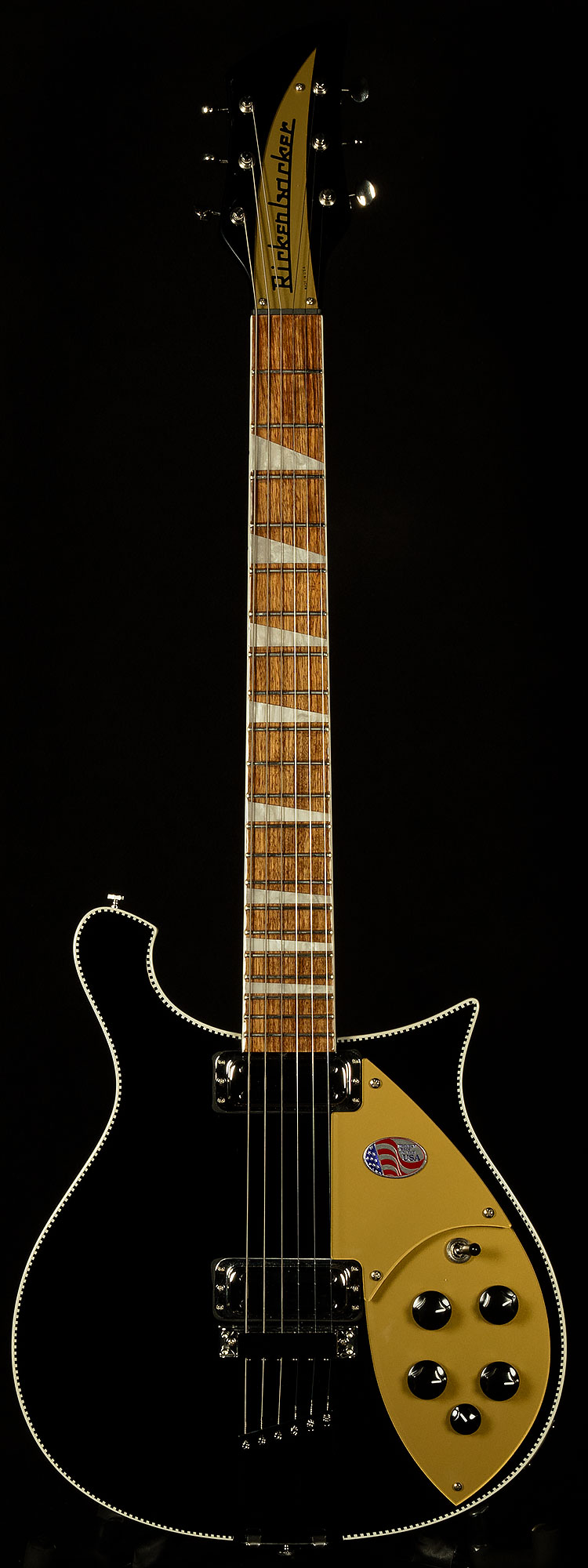 The Model 660 and 660/12 feature a charactered maple cutaway body based on an innovative design from the 1950s. Triangular pearloid inlay markers punctuate the glossy fingerboard beautifully, while the maple double bound neck and body are solid through and through. Rickenbacker's trademark "checkered" black and white binding set off the body, while white binding graces the neck. The 660 is electronically engineered to the exacting standards of the vintage reissue series, complete with Rickenbacker's own Vintage Single-Coil Toaster Top pickups.