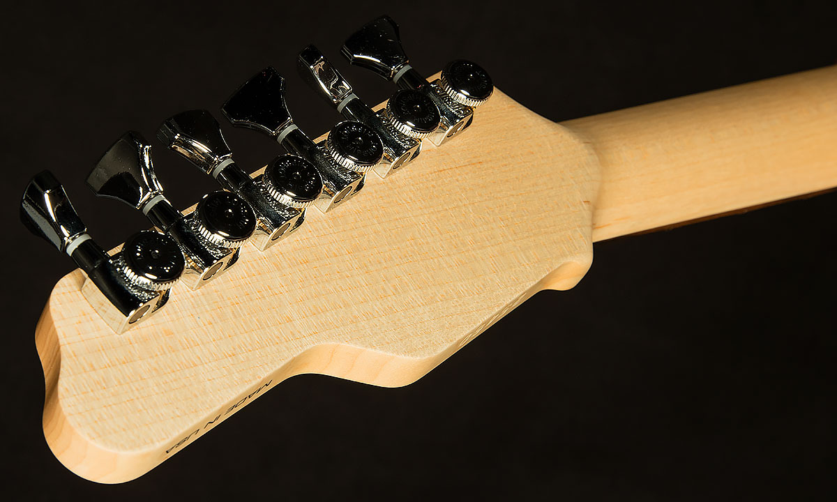 After spending a couple years as the main repair and restoration specialist at Norman’s Rare Guitars, he graduated to building guitars. At first, he assembled guitars out of parts from Schecter, Kubicki, and custom-made Tom Anderson parts. This was right as the Super Strat craze was taking off, and everyone in LA was looking for hot-rodded guitars with lightning-fast handfeel. James was the right man for the job.