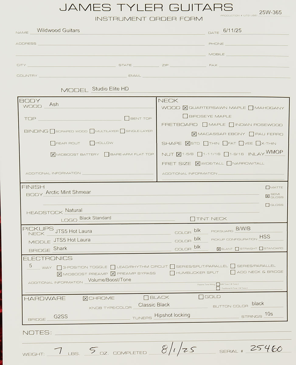 Tylers surged in popularity from then on, but James was never content to rest on his laurels. He pushed forward with innovative new finish techniques, and he came up with some of the coolest colors in the world with names like Psychedelic Vomit, Alien Guano, Barn Find, Malibu Beach Shmear, Burning Water, and our Wildwood-Exclusive finish, Ice Water. He also developed his own proprietary pickups, which sound absolutely otherworldly.