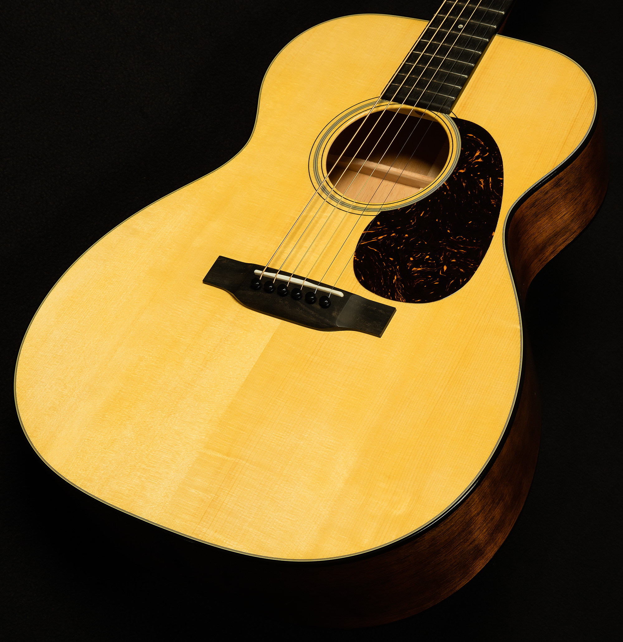 This means a few things: first, these 000-18s can simply get louder than other acoustic guitars; second, they maintain outstanding clarity at higher volumes, so you can dig in without the sound breaking up; third, because they have more volume on tap, they have a greater dynamic range. Adirondack spruce also produces a powerful fundamental--which gives these guitars a warm, woody tonality--and they impart an articulate, percussive quality to the attack. The dynamic range makes them wonderful for nuanced fingerpicking, while the headroom allows them to do a convincing impersonation of a dreadnought when you dig in.