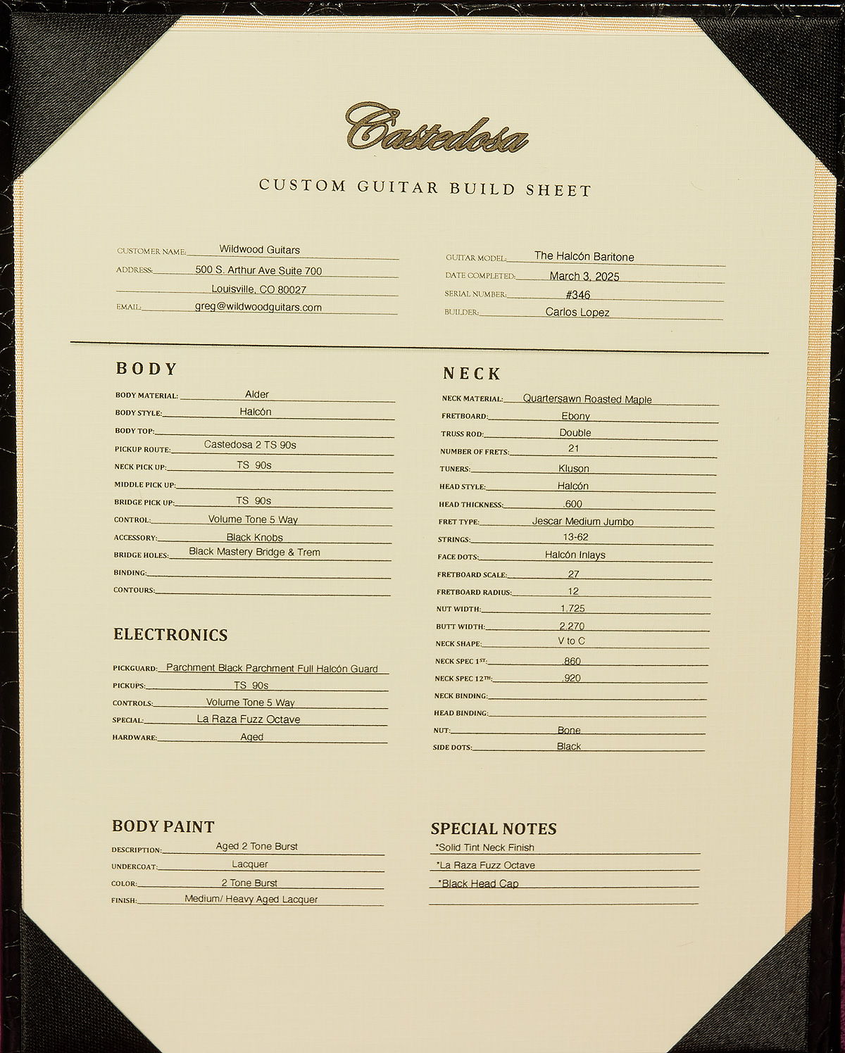 | Pickups | 3 Hand-Wound Castedosa TS-90s |