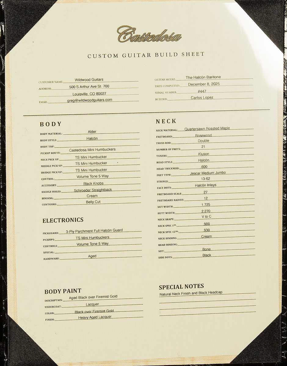 | Pickups | 3 Hand-Wound Castedosa TS Mini-Humbuckers |