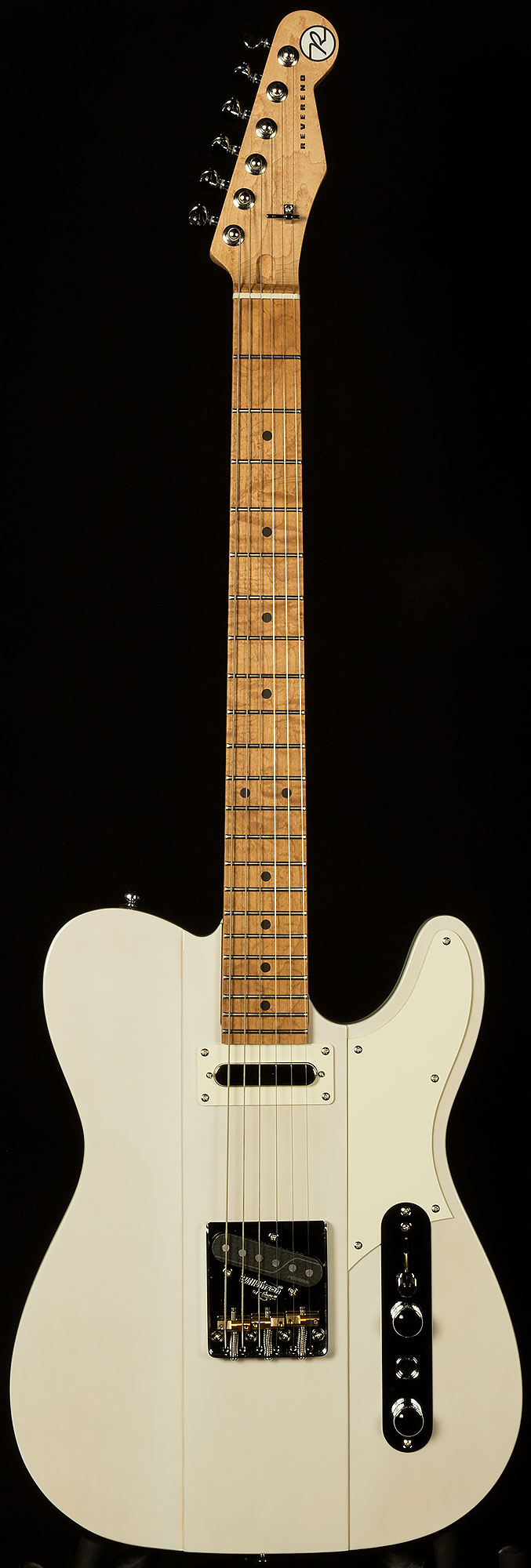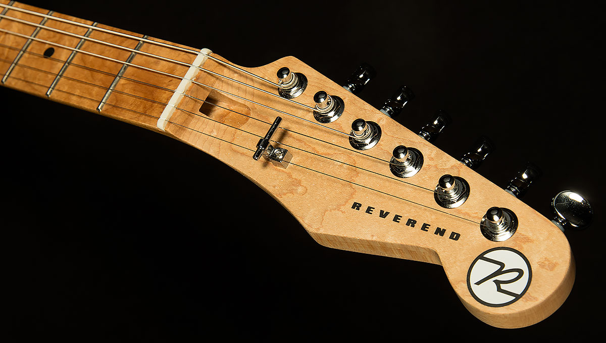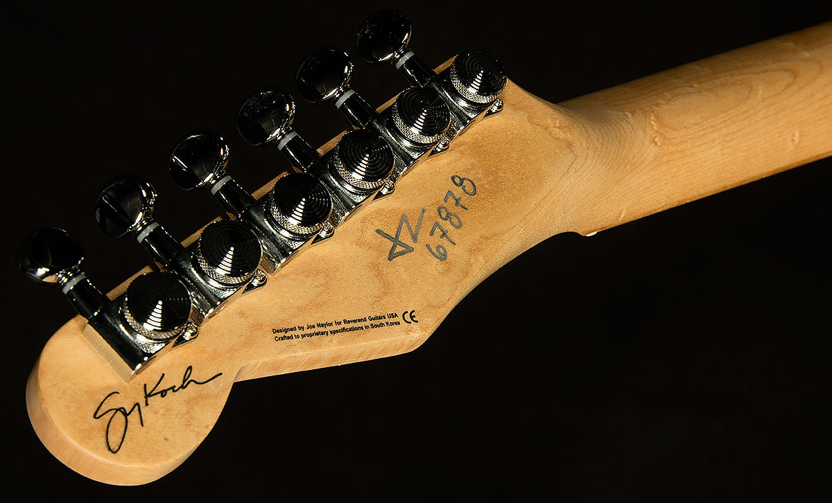 Next, the Gristlemaster's incredible build quality will jump out at you. When you sit down with The Gristlemaster, Reverend's impeccable craftsmanship and attention to detail are immediately apparent. A guitarist like Greg Koch needs a guitar with righteous build quality to withstand the onslaught of fretboard savagery that spills forth from his mighty hands, and the Gristlemaster is up to the task. Reverend's classic medium oval neck profile is as comfortable as your favorite pair of old sweatpants, and the fretboard has a Compound 10"-14" radius to allow for low setups and easy bending. And, with its pin-lock tuners and Boneite nut, changing strings on the Gristlemaster is a breeze, and its tuning stability is top-notch.