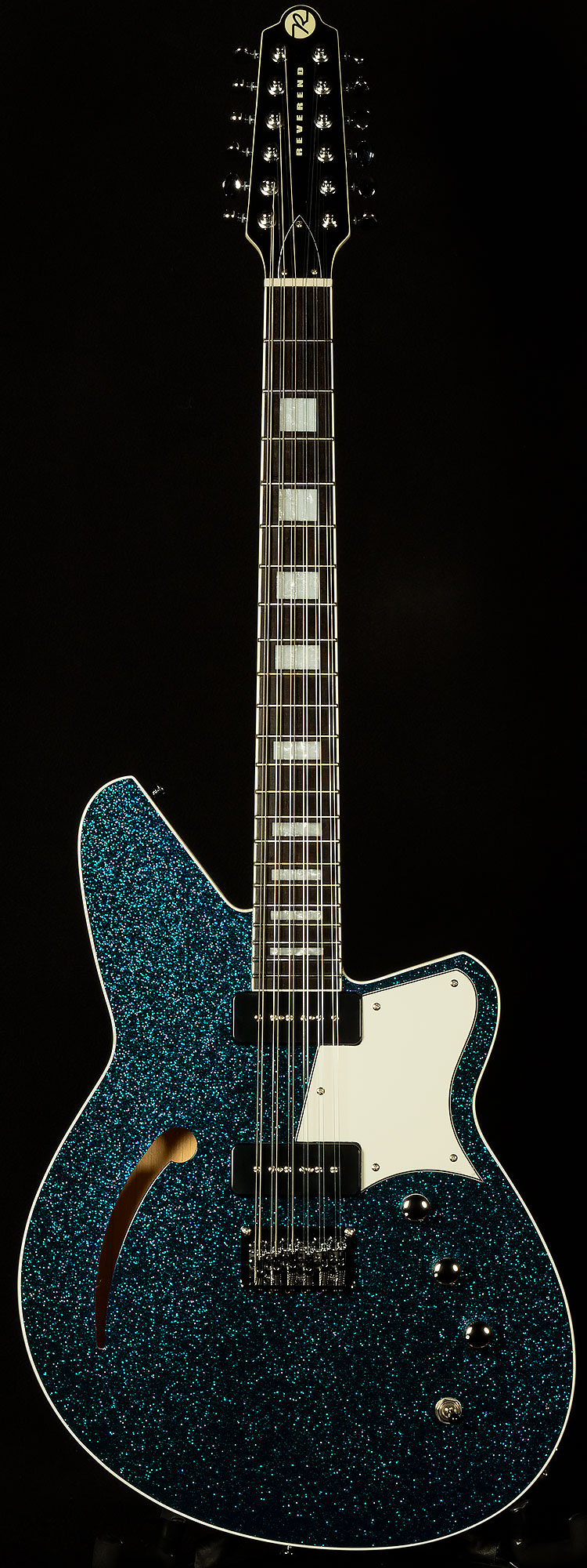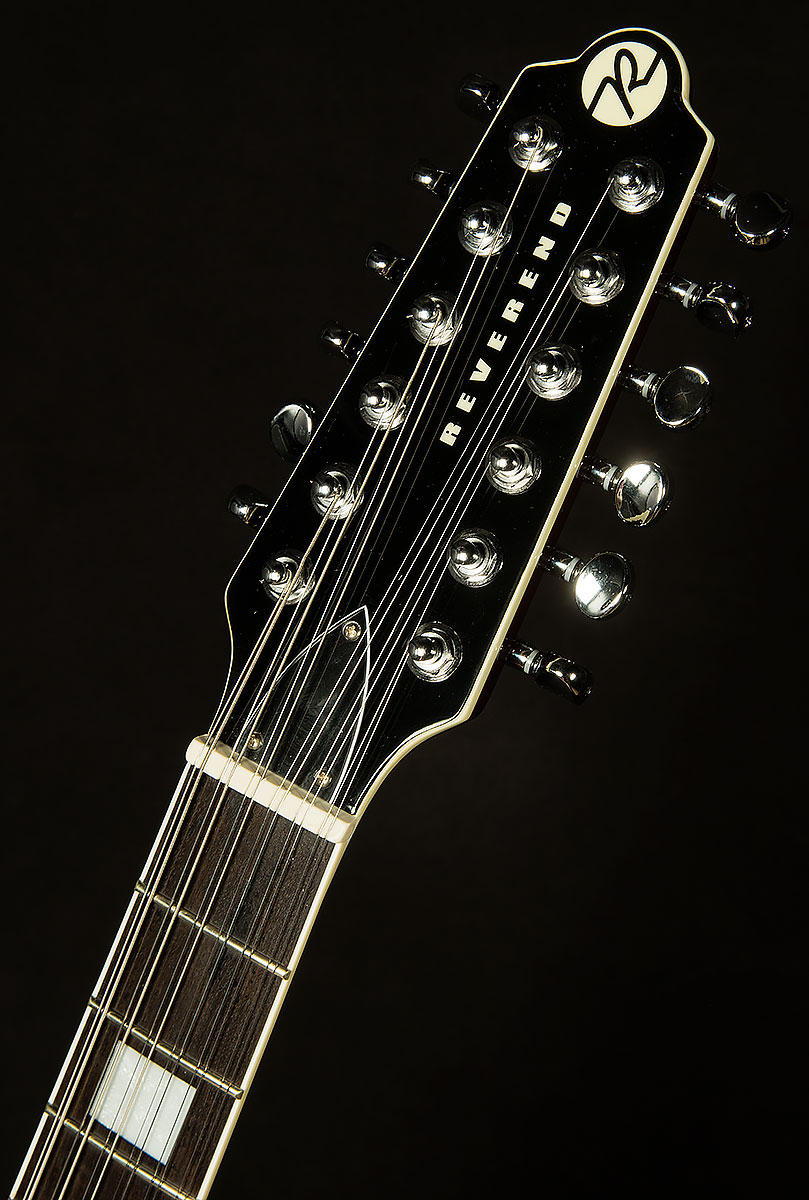 The most important of these appointments is the twelve-saddle bridge. Having the ability to tweak each string allows for precise intonation, which means that each every chord you play will be more in tune. That level of accuracy ensures that this twelve-string will always chime like a clocktower bell! Speaking of tuning, the Boneite nut and Reverend’s pin-lock tuners give this guitar fantastic tuning stability, so you won’t have to spend forever tuning in between songs.
