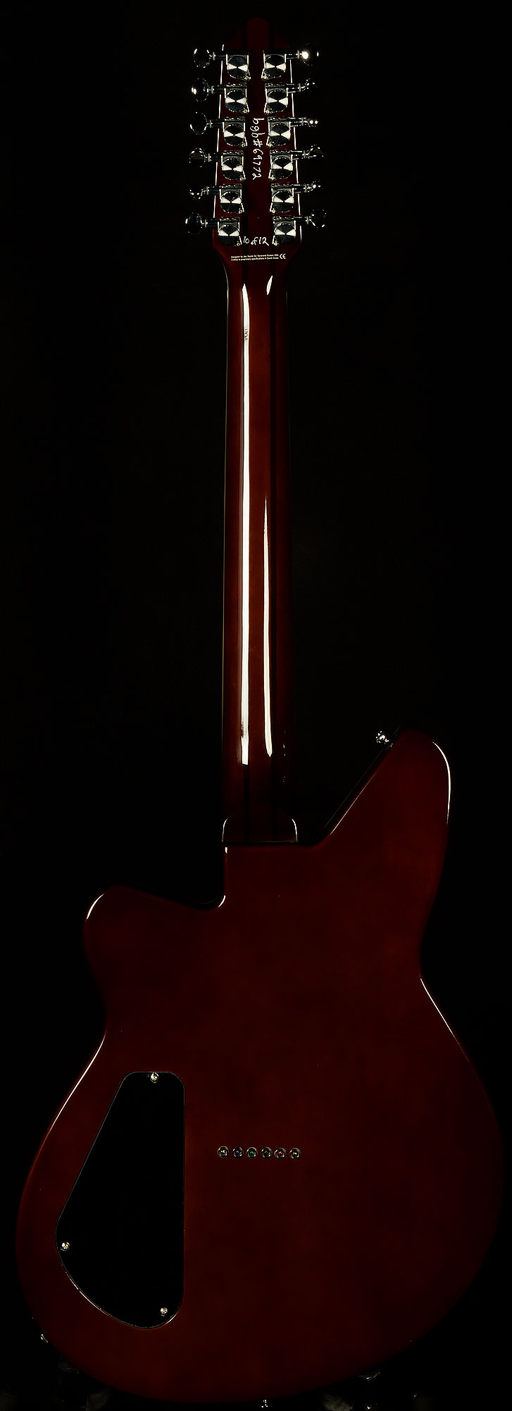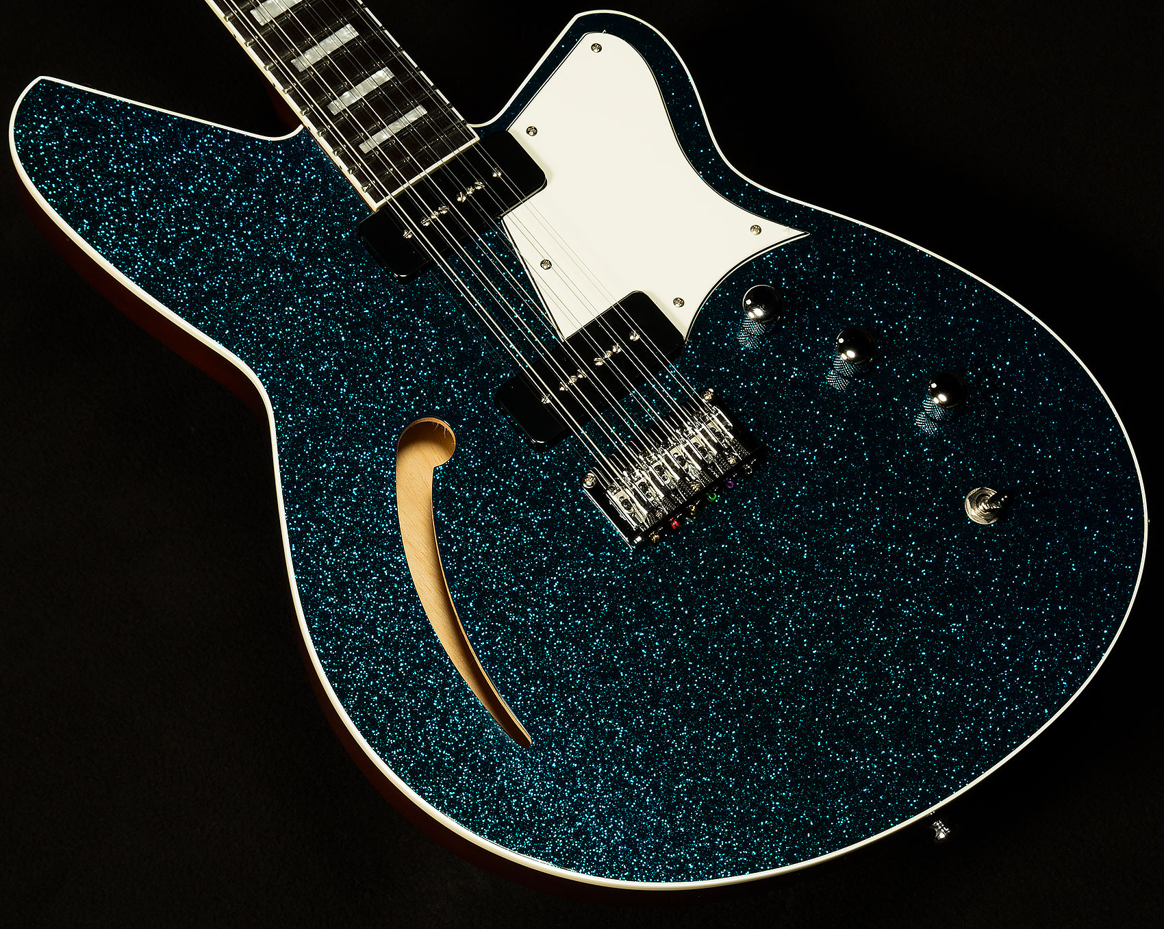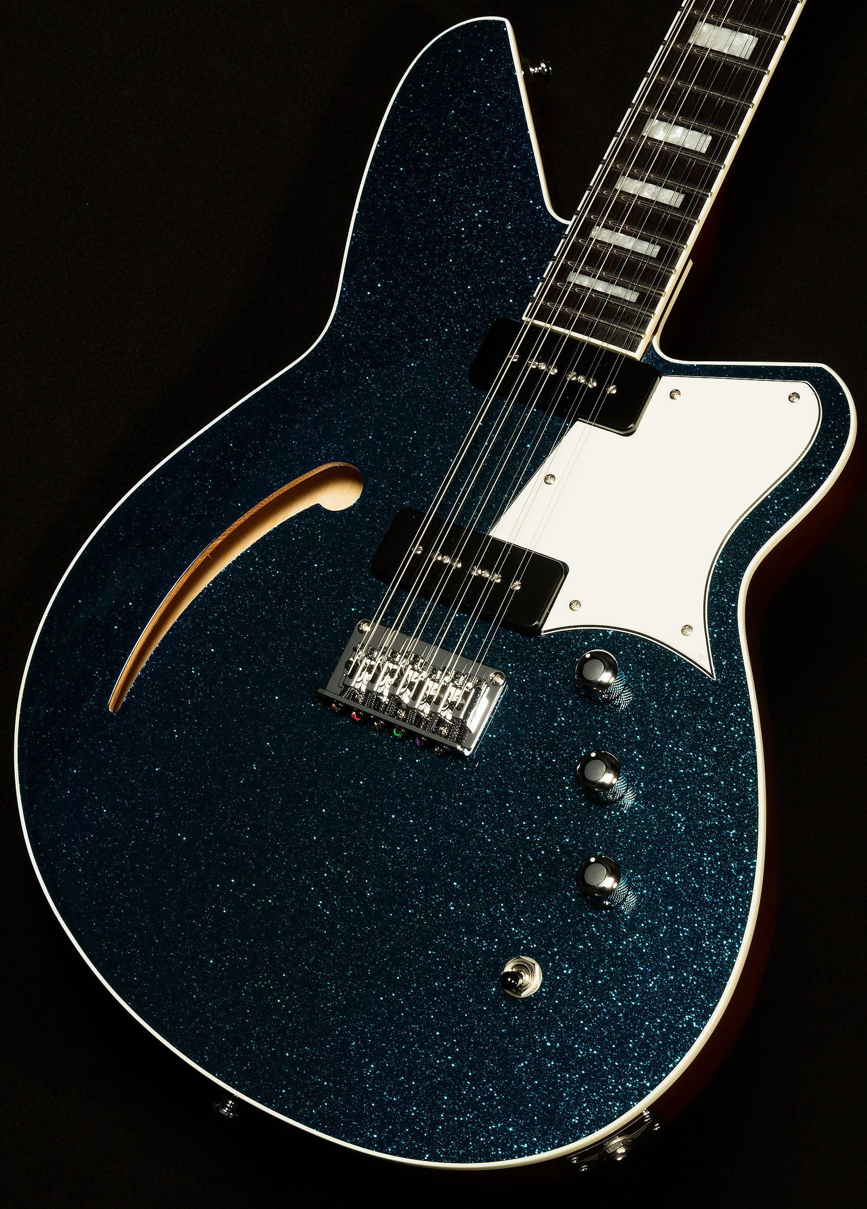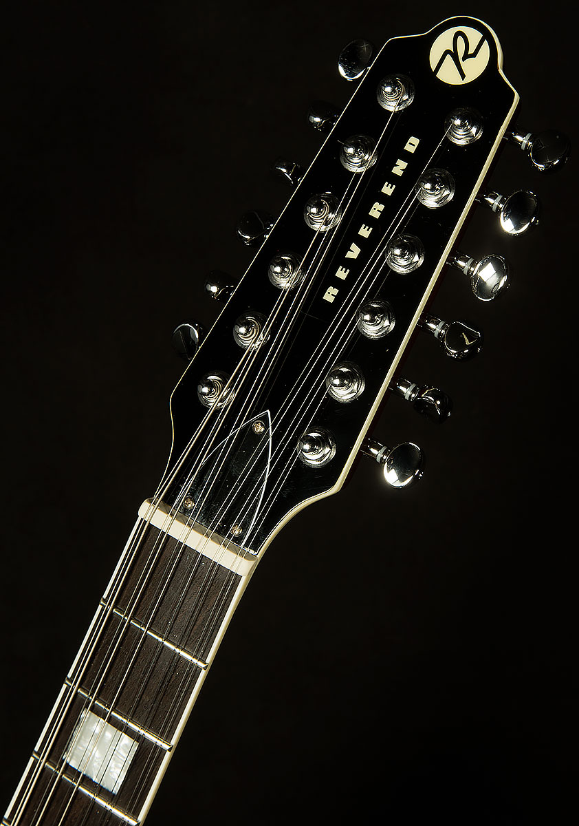 The most important of these appointments is the twelve-saddle bridge. Having the ability to tweak each string allows for precise intonation, which means that each every chord you play will be more in tune. That level of accuracy ensures that this twelve-string will always chime like a clocktower bell! Speaking of tuning, the Boneite nut and Reverend’s pin-lock tuners give this guitar fantastic tuning stability, so you won’t have to spend forever tuning in between songs.