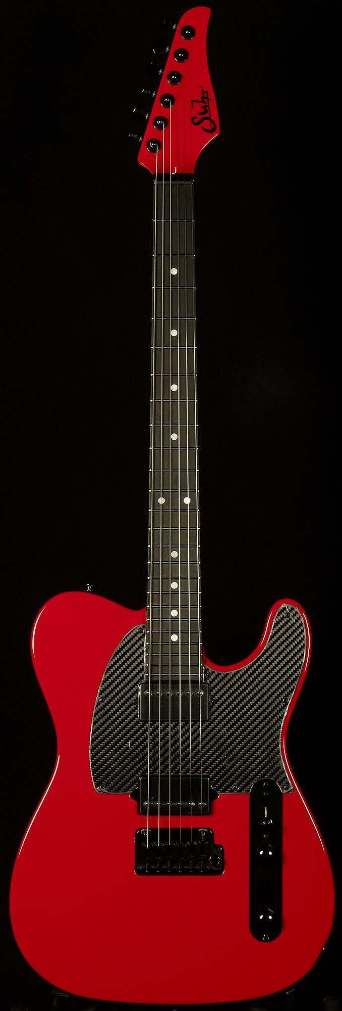 “The inspiration behind the anniversary guitar is really simple. Stay true to what made the old black prototype special, but give a more modern take on it. I’m crazy about cars, and when I came up with the design 10 years ago for the prototype, I envisioned it as a ‘muscle car.’ So it seems the only proper evolution was to pull inspiration from the exotic Italian super cars. Carbon fiber, black hardware, colors inspired from the 2 biggest Italian manufacturers, and lumilay side dots all just scream, ‘exotic super car.’ It’s a great way to celebrate 10 years of the Modern T. The Modern T: 100% Suhr and 100% A Wood. And this is a beautiful 10 year celebration.”