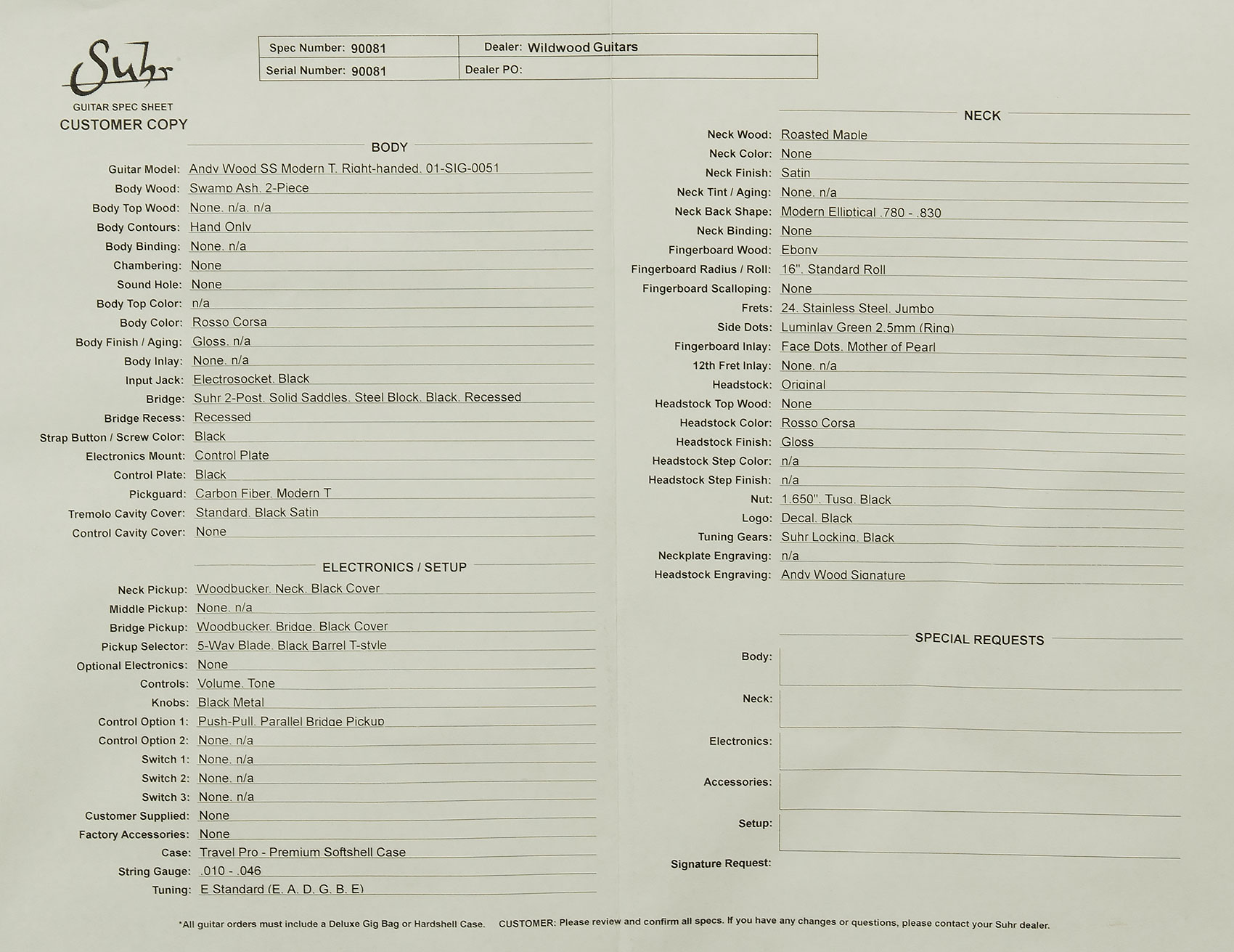 | Headstock | Matching Rosso Corsa Finish with Black Suhr Logo on Front, Laser-Engraved Andy Wood Signature on Back |