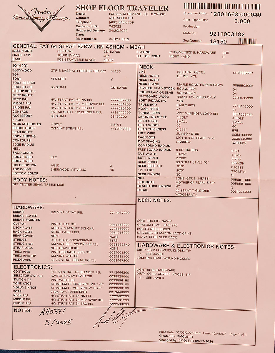 | Pickups | 3 Custom Shop Fat '64s Single-Coils Hand-Wound by Josefina |