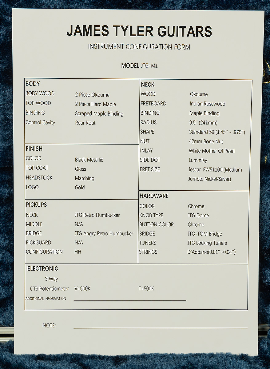 | Pickups | 1 JTG Retro Humbucker (Neck), 1 JTG Super Humbucker (Bridge) |