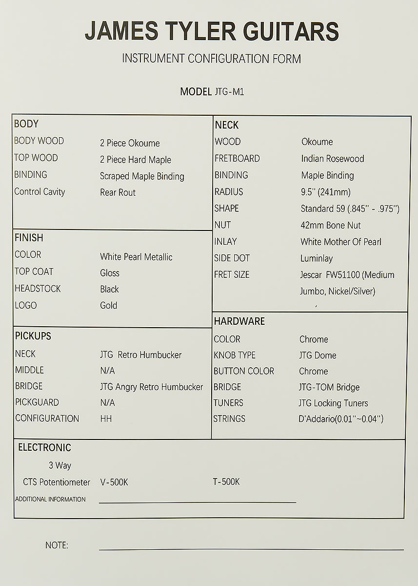 | Headstock | White Pearl Metallic with JTG Gold Logo |