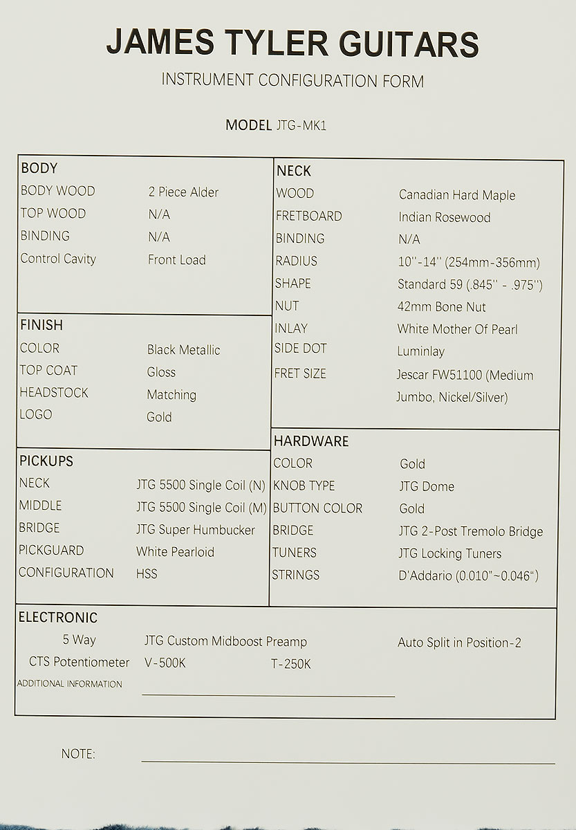 | Controls | 1 500K CTS Volume Pot, 1 250K CTS Tone Pot, 5-way Selector Switch, JTG Custom Midboost Control with Bypass Button |