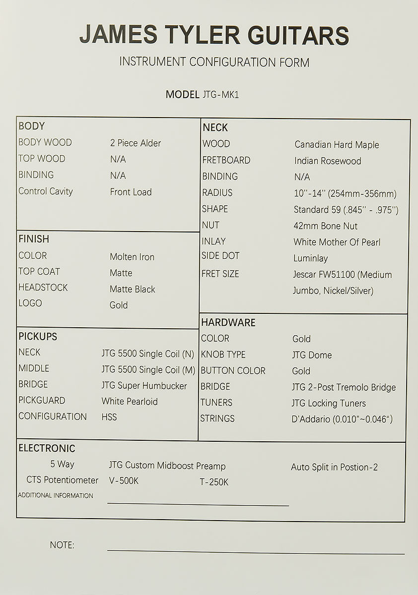 | Controls | 1 500K CTS Volume Pot, 1 250K CTS Tone Pot, 5-way Selector Switch, JTG Custom Midboost Control with Bypass Button |