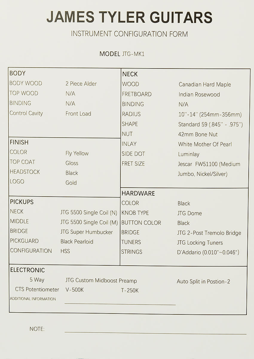 Controls1 500K CTS Volume Pot, 1 250K CTS Tone Pot, 5-way Selector Switch, JTG Custom Midboost Control with Bypass Button