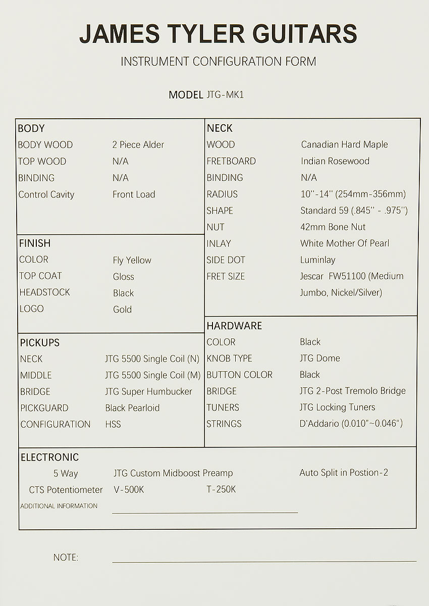 | Controls | 1 500K CTS Volume Pot, 1 250K CTS Tone Pot, 5-way Selector Switch, JTG Custom Midboost Control with Bypass Button |