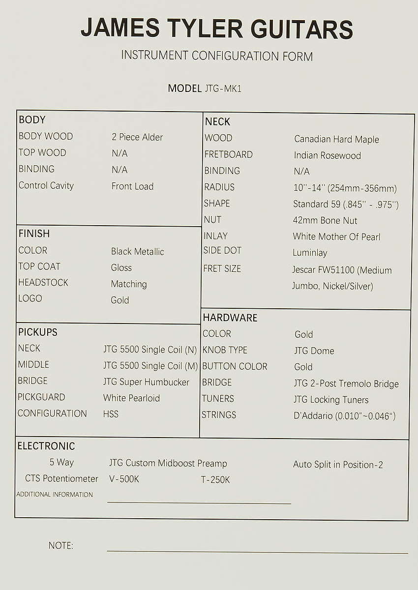 | Controls | 1 500K CTS Volume Pot, 1 250K CTS Tone Pot, 5-way Selector Switch, JTG Custom Midboost Control with Bypass Button |