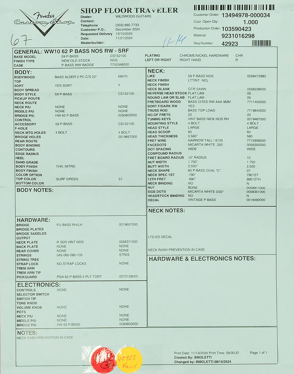 Fender Custom Shop Wildwood 10 1962 Precision Bass – NOS