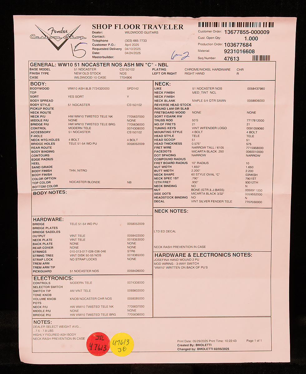 Because of their incredible rarity, original Nocasters have become some of the most desirable vintage pieces out there. So, we decided to team up with our friends at the Fender Custom Shop and issue a Wildwood 10 version that marries the vibe of the originals with modern ergonomics. The Wildwood-exclusive 10″ radius and 6105 frets are a perfect pairing with the '60 Oval C profile, and the Custom Shop hand-wound Twisted Tele pickups deliver spectacular sounds. We’re sure you’ll find a Nocaster here that will grab you by your heartstrings, so we invite you to browse away–just make sure your keyboard drool shield is in place!