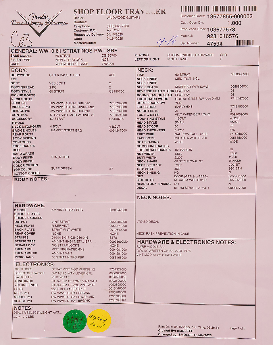 | Pickups | 3 Hand-Wound AlNiCo II Wildwood 10 Strat Single-Coils |