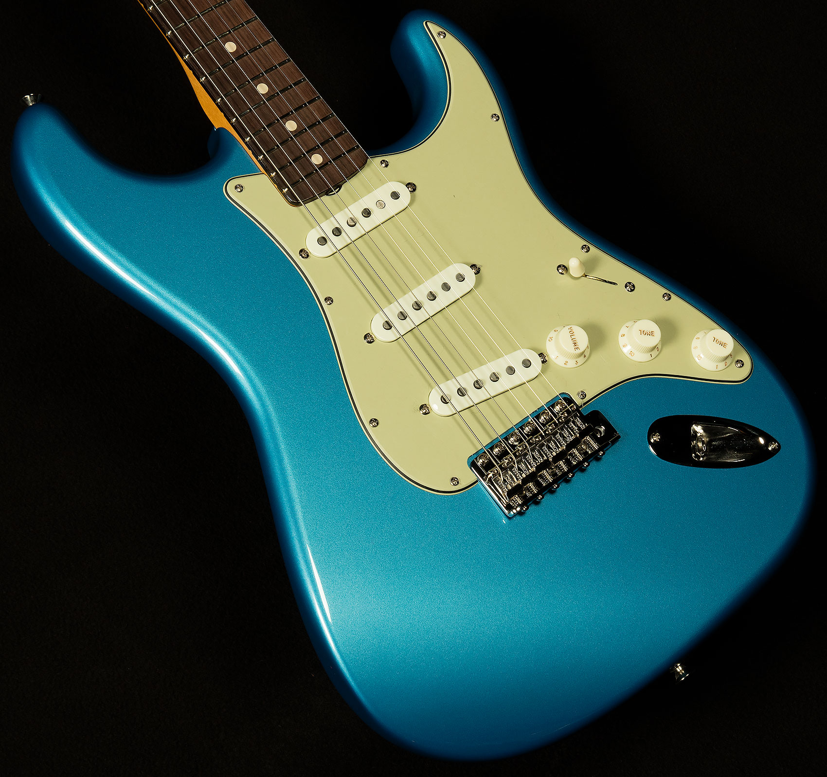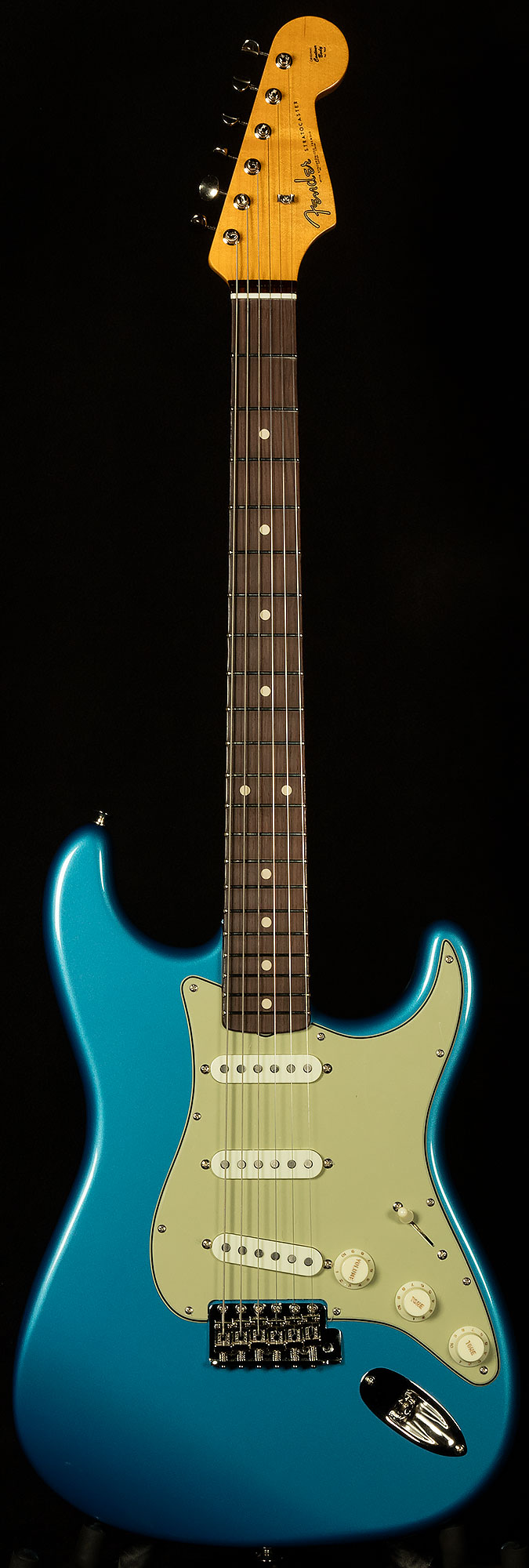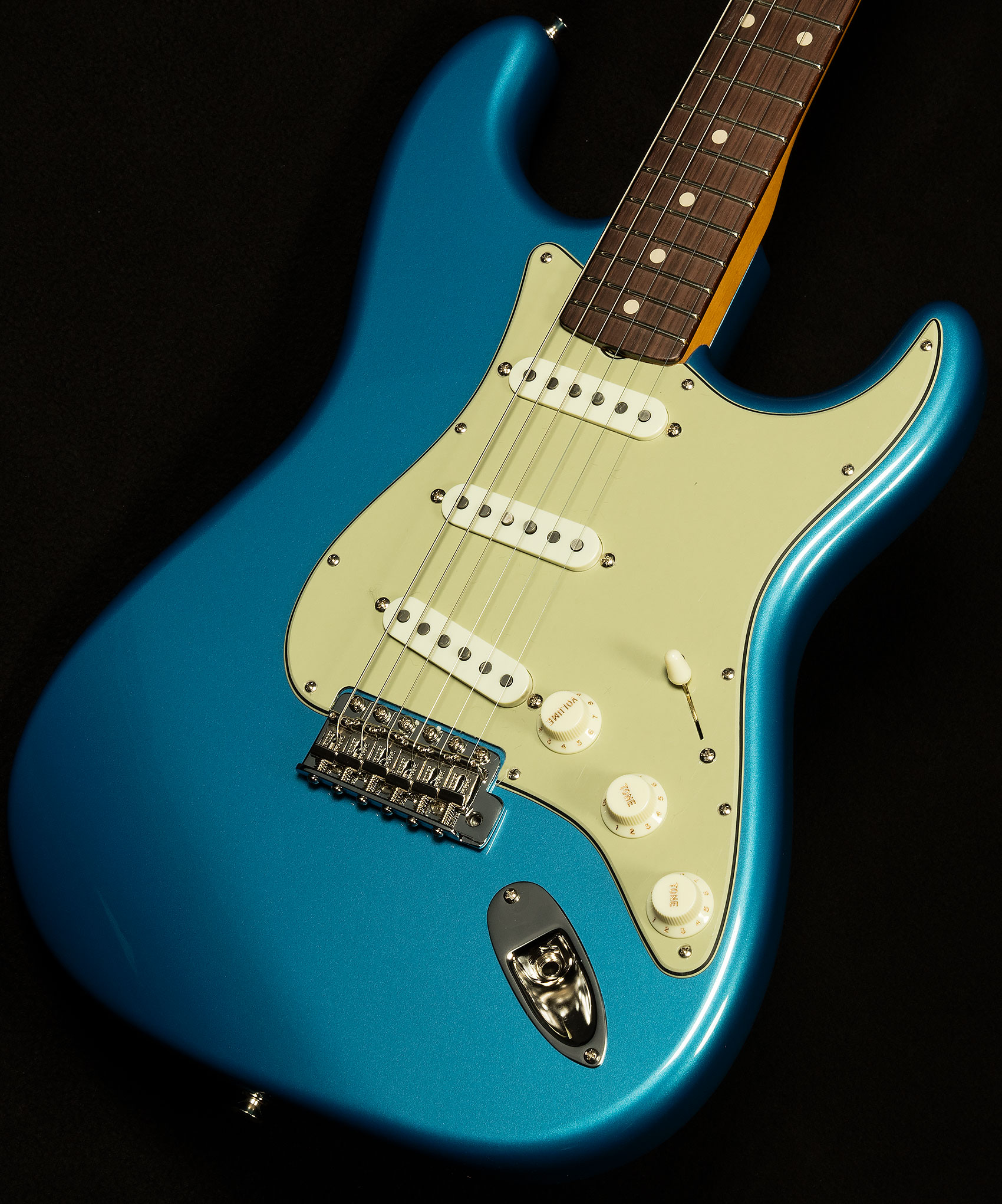 We believe that the Wildwood 10 Strat pickups our friends at Fender wind for us are some of the finest single-coils in the world. Here's a quick rundown of what makes them tick. They're slightly underwound, which gives them exceptional dynamic response and touch sensitivity. You can really alter your sound based on how hard you're hitting, which makes for a wonderfully expressive playing experience. However, they are wound with thicker wire like Fender did in the sixties, which gives them a little more power and guts despite being underwound. As a result, their voice is similar to vintage Strat pickups we love with lots of bell-like chime and vocal response, but with a little extra warmth and muscle.
