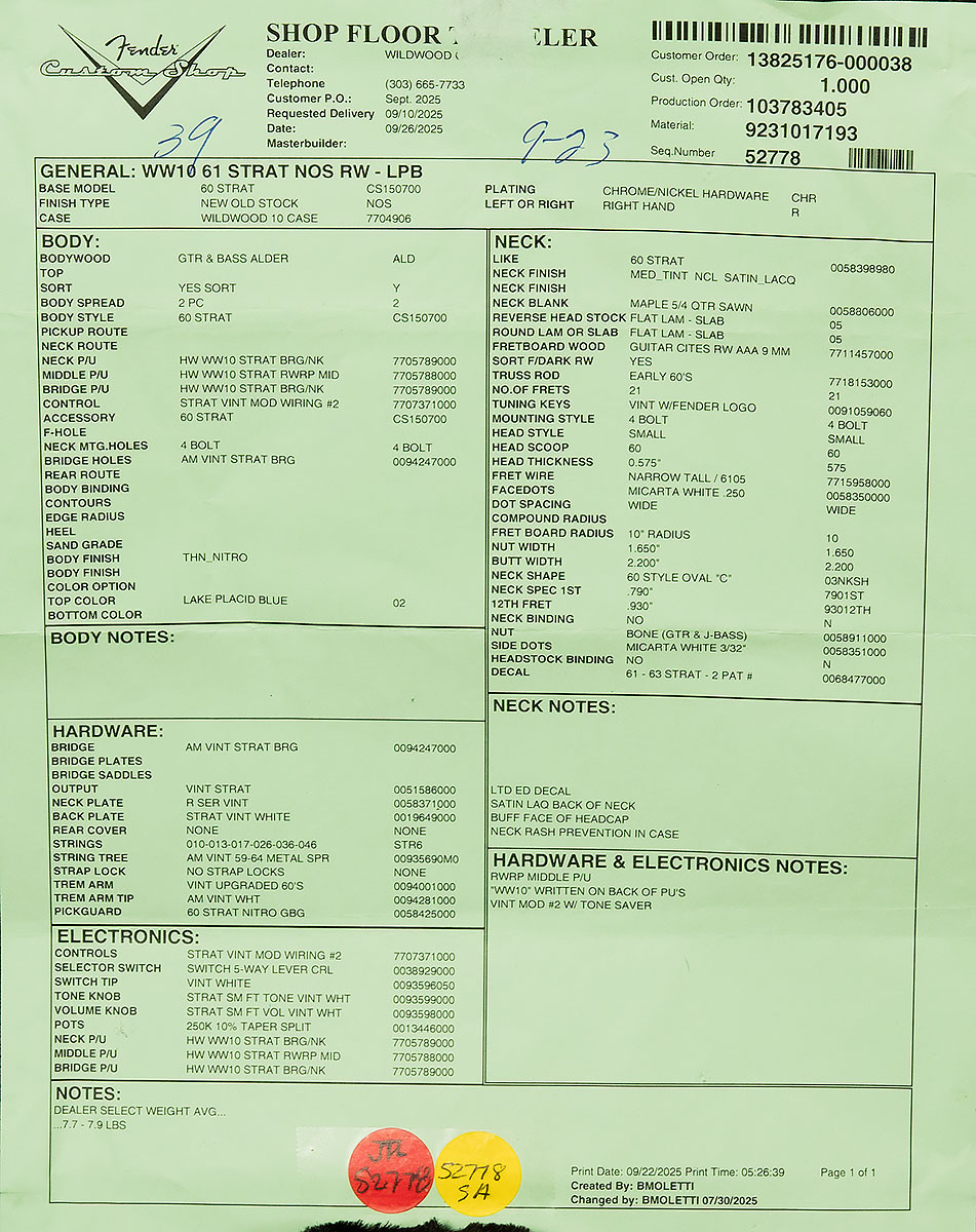 Each of these Custom Shop creations features a thin fifties-style nitrocellulose finish, which allows the voice of the resonant hand-selected tonewoods to shine through. They also have hand-wound Custom Shop pickups that are sure to inspire you to reach new heights on your sonic journey. Wildwood 10s feel great in your hands, too. Their modern 10” radius is suitable for a wide variety of styles and techniques, and their 6105 narrow-tall frets allow you to expend less energy with your left hand, especially when bending strings. To top it all off, they come with a limited edition Dealer Select Wildwood 10 hardshell case and a certificate of authenticity.