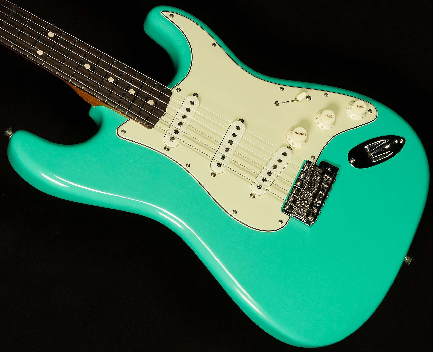 We believe that the Wildwood 10 Strat pickups our friends at Fender wind for us are some of the finest single-coils in the world. Here's a quick rundown of what makes them tick. They're slightly underwound, which gives them exceptional dynamic response and touch sensitivity. You can really alter your sound based on how hard you're hitting, which makes for a wonderfully expressive playing experience. However, they are wound with thicker wire like Fender did in the sixties, which gives them a little more power and guts despite being underwound. As a result, their voice is similar to vintage Strat pickups we love with lots of bell-like chime and vocal response, but with a little extra warmth and muscle.