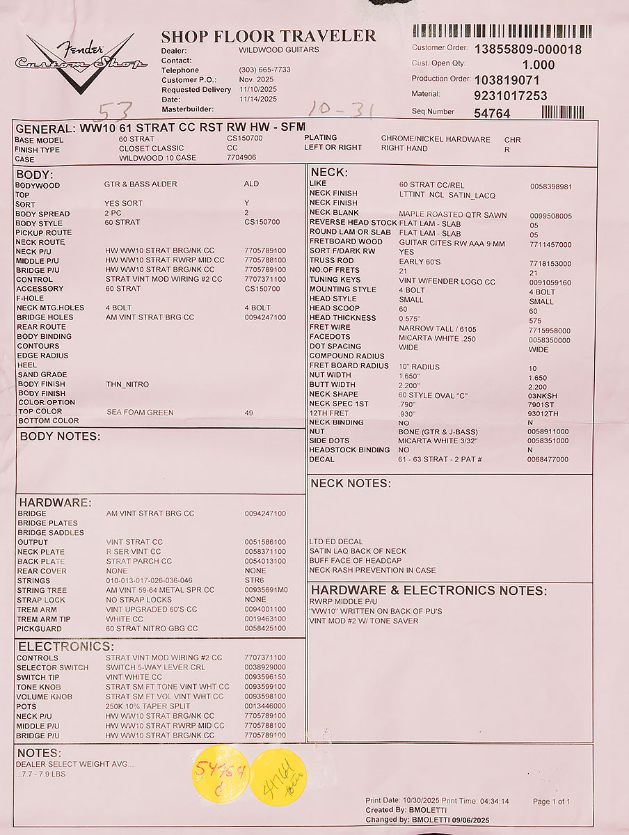 Each of these Custom Shop creations features a thin fifties-style nitrocellulose finish, which allows the voice of the resonant hand-selected tonewoods to shine through. They also have hand-wound Custom Shop pickups that are sure to inspire you to reach new heights on your sonic journey. Wildwood 10s feel great in your hands, too. Their modern 10” radius is suitable for a wide variety of styles and techniques, and their 6105 narrow-tall frets allow you to expend less energy with your left hand, especially when bending strings. To top it all off, they come with a limited edition Dealer Select Wildwood 10 hardshell case and a certificate of authenticity.